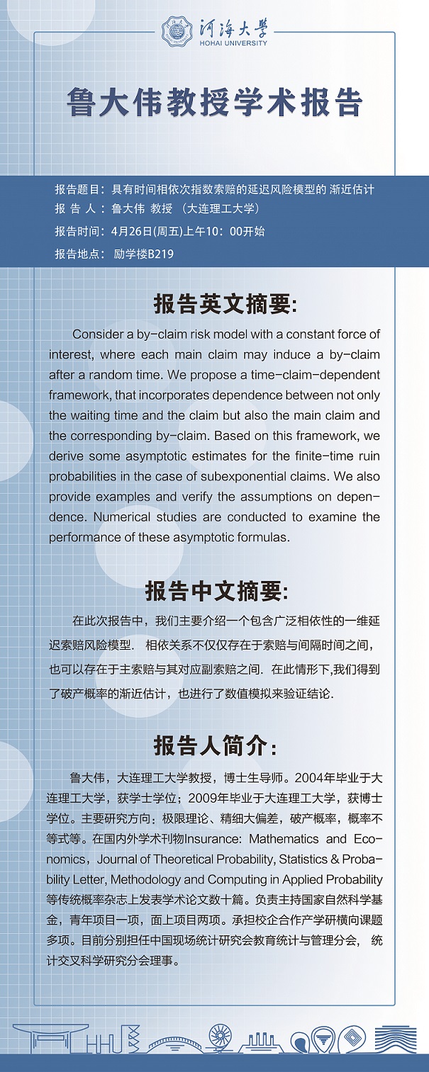 品凤楼 2024年第6次学术报告:具有时间相依次指数索赔的延迟风险模型的渐近估计