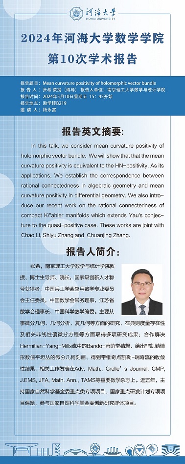 品凤楼 第10次学术报告:Mean curvature positivity of holomorphic vector bundle