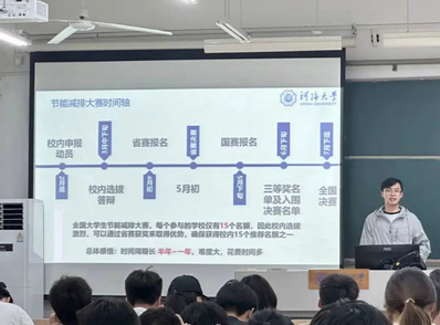首先,阮宏民同学以自己参加的“节能减排大赛”为例详细地介绍了大赛的具体时间轴以及自己的获奖经验,并表达了自己参加大创后的感悟,希望同学们能恰当选择自己的大创内容从而获得自己所期待的成绩。
