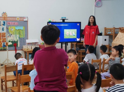 在第二个班级中,志愿者开展了关于光的科学小实验。志愿者通过将彩色的画放入水中,产生了画的颜色消失的现象,通过现象告诉了小朋友们光的折射这一神奇的原理。