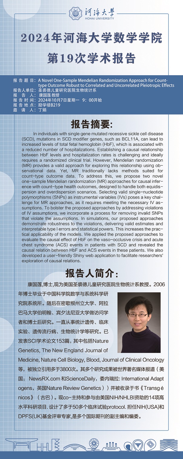品凤楼 第19次学术报告:A Novel One-Sample Mendelian Randomization Approach for Count-type Outcome Robust to Correlated and Uncorrelated Pleiotropic Effects