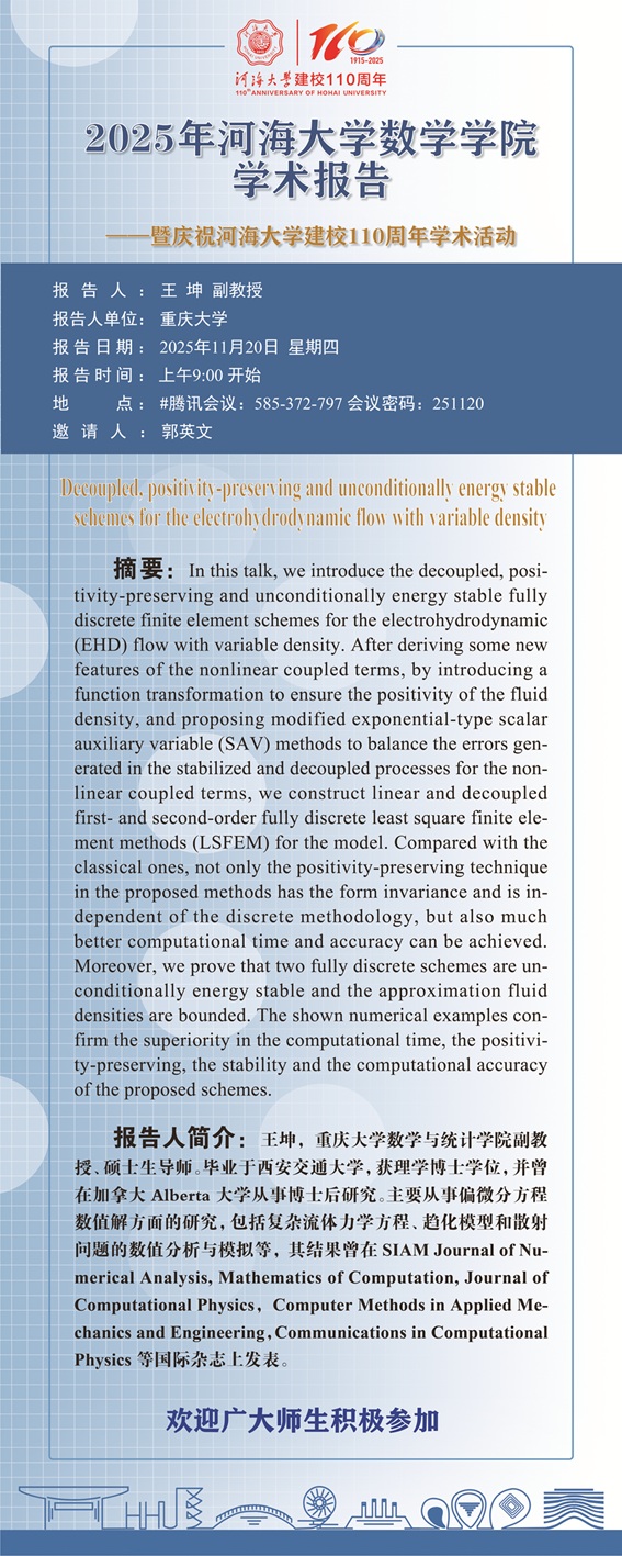 品凤楼 第29次学术报告:Decoupled, positivity-preserving and unconditionally energy stable schemes for the electrohydrodynamic flow with variable density
