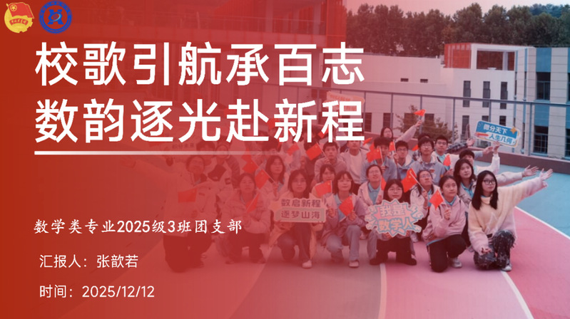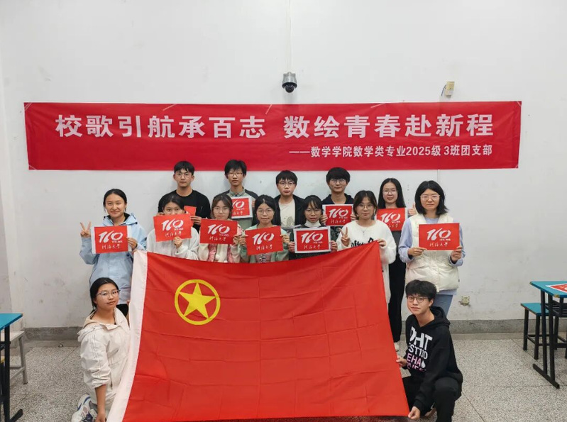 为响应校团委提升新生团支部活力、引导新生锚定成长方向的号召,自2025年9月起,2025级数学3班团支部以“我的大学100天”为时间坐标,精心打造了四大维度的系列主题教育活动。活动以“毓秀蔚新生,数学心向党”、“学术引航向,昌明砺金深”、“躬身践初心,乐水利物行”、“逐梦启新程,毋负邦人期” 四个板块为主线,深入挖掘校歌内核,构建“精神铸魂-专业赋能-实践担当-青春立誓”的育人闭环,致力于将团支部打造为信念坚定、学风浓厚、团结向上的先进集体,引领全体同学努力成长为具有严谨逻辑、创新意识、担当精神的新时代数理人才,为服务国家科学与技术发展贡献智慧与力量。