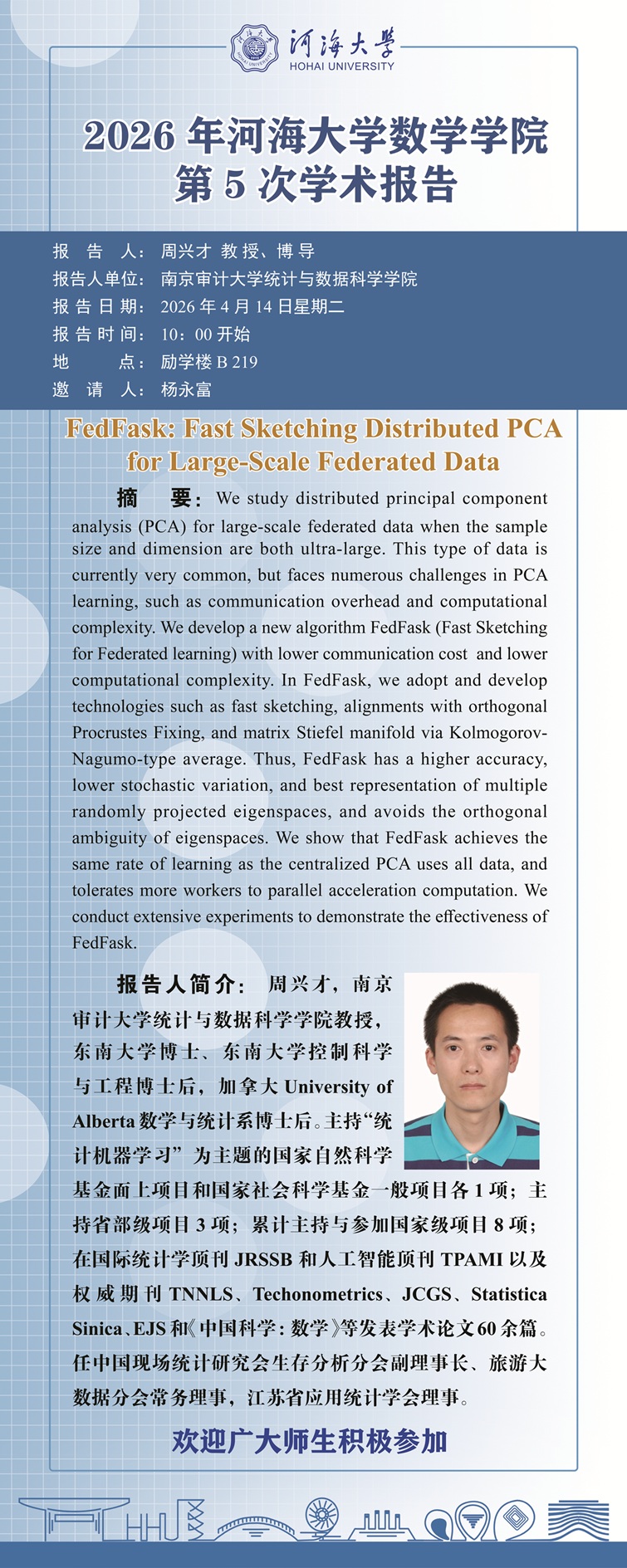 品凤楼 2026年第5次学术报告:FedFask Fast Sketching Distributed PCA for Large-Scale Federated Data
